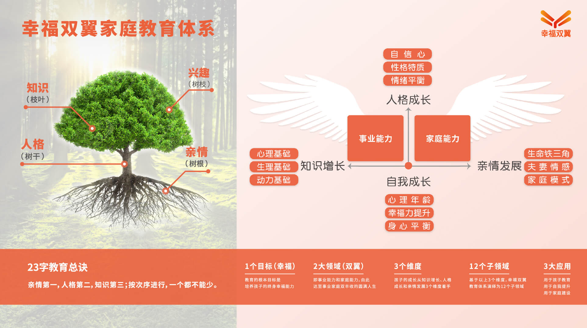 幸福双翼以幸福双翼教育体系为核心,以培养孩子的终身幸福能力为根本目标,旨在全面推动与实践科学、专业、系统的家庭教育体系,以最专业、最落地、最系统的精髓,给家庭教育以全方位的指导。